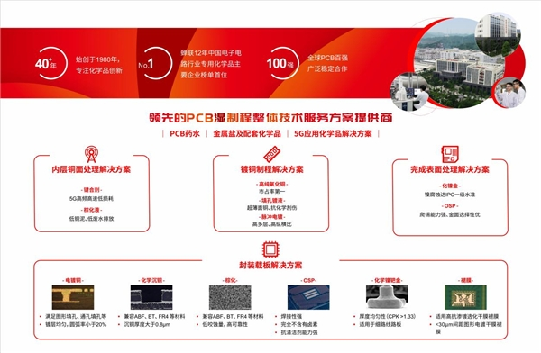 特别是为了打破中国高端电子化学品长期依赖进口的局面,光华科技在21世纪初切入电子化学品领域,在2017年围绕第三代PCB互连镀铜关键技术瓶颈,打破国外企业在该领域对我国企业的封锁;2021年聚焦于封装基板的铜互联制程关键技术,联合攻克基板产业供应链安全“卡脖子”制约问题,持续推动国内集成电路产业链的国产化和本土化进程。作为“国家高新技术企业”、“国家重点新产品”、“国家知识产权优势企业”等荣誉资质获得者,光华科技在业内已经得到全球众多知名企业的认可与肯定。其中,在N.T.Informaition统计公布的全球PCB百强生产商名单中,有超60家企业已是光华科技的合作客户;在前10强生产商中,有9家企业是光华科技的合作客户。
