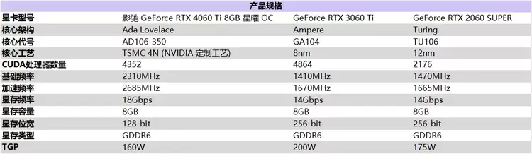 首先来看一下影驰 GeForce RTX 4060 Ti 8GB 星曜 OC 规格参数对比: