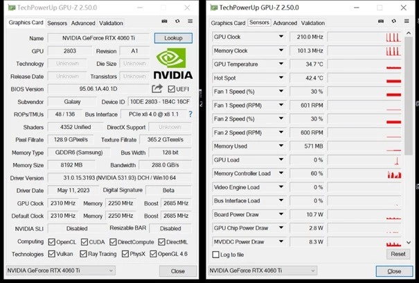 检测软件GPU-Z中,玩家们可以得到影驰 GeForce RTX 4060 Ti 8GB 星曜 OC 的产品规格和基本参数,通过数据可以得知其待机温度为34.7°C,功耗为10.7W。