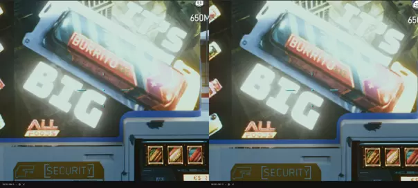 从对比结果可以看出,使用RTX VSR后,视频质量拥有明显的提升。在原生视频下的分辨率低,画面质量也是相对模糊的。而开启RTX VSR后,图像变得更为清晰,且画面物体更为突出,画面细节更加清晰锐化。相比起原生视频,开启该技术后的画面拥有更高清的输出分辨率。RTX VSR还能做到消除压缩伪影的能力,从而图像质量也能得到进一步的优化。玩家们和创作者们可以自行选择视频增强的程度。