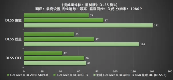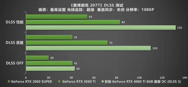 接下来将通过对比影驰 GeForce RTX 4060 Ti 8GB 星曜 OC、 GeForce RTX 3060 Ti和GeForce RTX 2060 SUPER 的游戏数据让玩家们感受到影驰 GeForce RTX 4060 Ti 8GB 星曜 OC 的性能,以及NVIDIA DLSS技术的强悍之处。游戏测试分别是《赛博朋克 2077》、《霍格沃兹之遗》、《消逝的光芒2:人与仁之战》、《巫师3:狂猎》以及《漫威蜘蛛侠:重制版》。游戏测试所采用的分辨率为1080P 和 2K 两个分辨率。对比数据为DLSS 关闭,DLSS 质量模式 和DLSS 性能模式,影驰 GeForce RTX 4060 Ti 8GB 星曜 OC 采用NVIDIA DLSS 3技术,