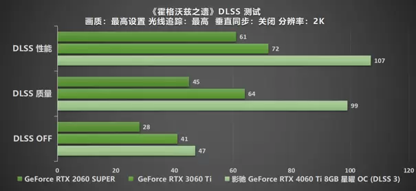 2K分辨率下的影驰 GeForce RTX 4060 Ti 8GB 星曜 OC 的成绩为47帧,开启DLSS 3质量模式后的帧数为64帧,而DLSS 3性能模式下则是拥有了超过100帧的高分。另一边,GeForce RTX 3060 Ti 和 GeForce RTX 2060 SUPER 在DLSS 技术的加持下也能够到流畅运行的门槛,分别为72帧和61帧。