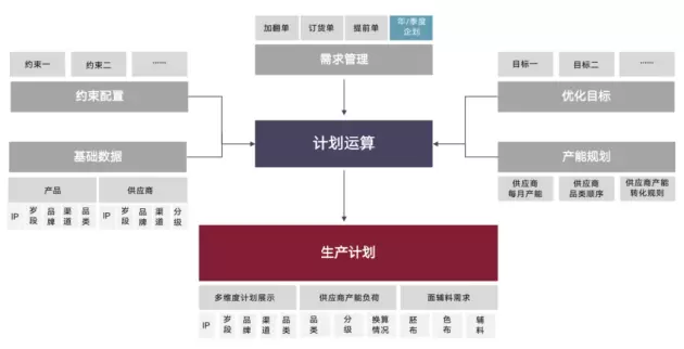 系统主要包括产能规划、初版排单、齐色排单、大货排单四大模块,分别对应着服装生产的不同时间周期,尽管每个模块排单的影响因素有差异,基本优化思路是一致的,即通过建模和求解得到优化的生产计划,最终将每个款式按品牌、面种、渠道、岁段、品类等标签分配到具有对应生产能力的供应商。