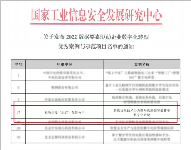 在国内服装行业,工厂排单普遍都是依靠人工决策的,杉数科技和森马的成功实践为服装行业数字化改革探索出新的方向和道路,从技术赋能场景的方法论,到体系化的创新思维和场景化的落地经验,都具有开创性意义。凭借前瞻性、创新性以及显著的价值效益,该项目入选国家工业信息安全发展研究中心《2022数据要素驱动企业数字化转型优秀案例和示范项目》,为工业生产制造领域数字化转型升级提供了非常有益的参考和借鉴。