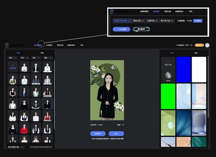世君云AI数字人聘请全网最顶尖的端口搭建师,历经几十次客户端更新重做,带来了现阶段最直观化的AI云端界面,一键智能文案管理,四大话术搭建平台,还能输入关键词一键AI生成文案,解决99%的带货话术需求。