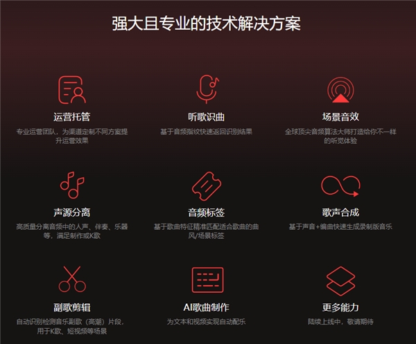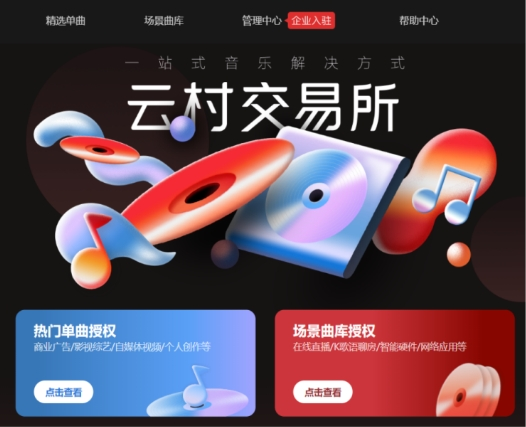 “云村交易所”推出商业应用场景的一站式音乐解决方案,面向直播K歌等线上应用、商业影视、线下公播、智能家居等诸多应用场景,极大提高了正版音乐授权服务的便捷性。相关授权服务适用于运营商、手机厂商、IoT、短视频、K歌、语聊、直播、MCN、综艺影视等领域,应用场景广泛。