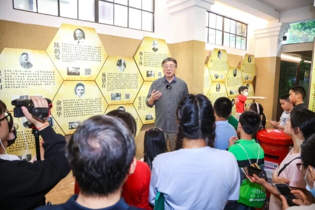 图6:全国最美志愿者、施蛰存邻居霍白介绍愚园路文化名人墙