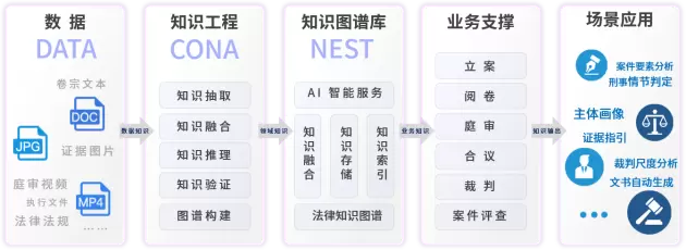 法治建设信息化发展地不断推进,产生并且积累了海量的法律行业数据资源,通过大数据技术对数据进行知识化抽取、融合、推理、验证,构建法律行业专业知识图谱,支撑智能立案、案件庭审、证据指引、自由裁量等各业务场景,将数据转化为司法知识来支撑法律服务场景数字化,实现“数据取之于民,用之于民”。