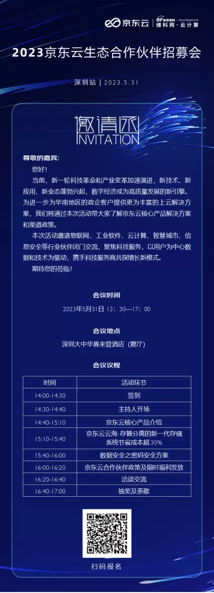 本次招募大会,京东云本着“能力共享、资源共享、生态共享、利润共享”的原则,致力于构建开放、共赢的生态合作体系,2023京东云生态合作伙伴招募现已正式启动!想了解更多详情,请扫描下方海报二维码,快来报名吧!