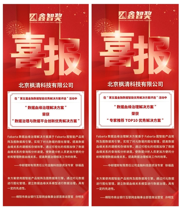 5 月 23 日,由金科创新社主办、全球金融专业人士协会支持的“2023 鑫智奖·第五届金融数据智能优秀解决方案评选”评选结果正式揭晓。Fabarta 数据血缘治理解决方案荣获“专家推荐 TOP10 优秀解决方案”及“数据治理与数据平台创新优秀解决方案”两项奖项。