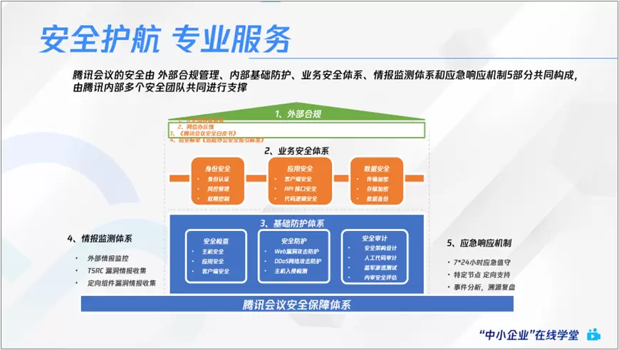 基于企业对于多元办公模式以及办公安全的需求,腾讯会议建立了包含外部合规管理、内部基础防护、业务安全体系、情报监测体系和应急响应机制在内的五部分安全保障,将腾讯在安全领域的实践研究融入自身产品体系中,保障用户办公的稳定流畅与安全。