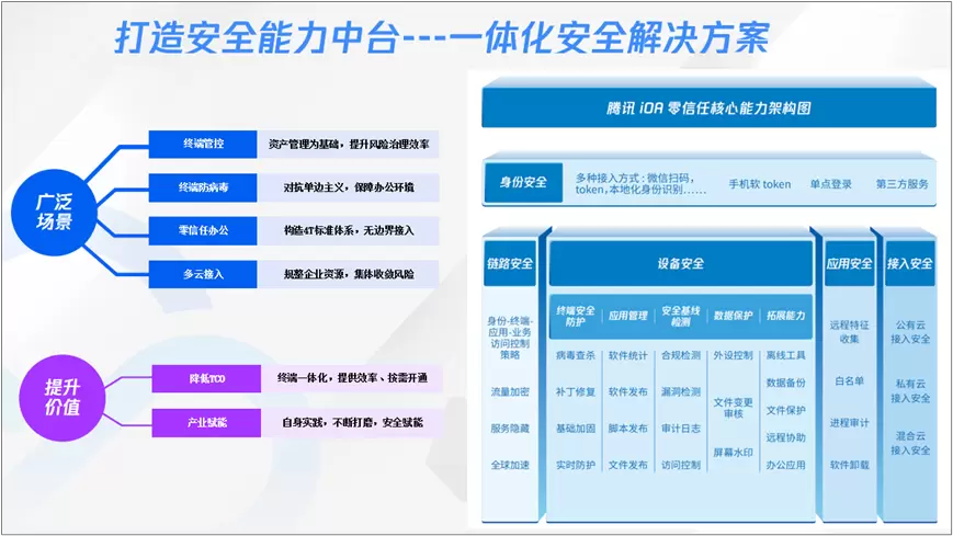 面对数字办公带来的安全、业务、管理难题,腾讯的iOA零信任管理系统能够基于身份安全、链路安全、设备安全、接入安全、应用安全提供终端访问管理方案,并部署安全能力,帮助企业构建全链路可信的访问架构,实现终端管控、终端防病毒、零信任办公、多云接入等场景的广泛应用。