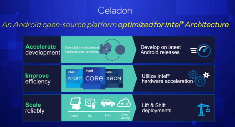Celadon则是针对Intel架构优化的Android堆栈,可以帮助开发者更快速、更便捷地将Android应用移植到x86平台,而且它是完全开源的。