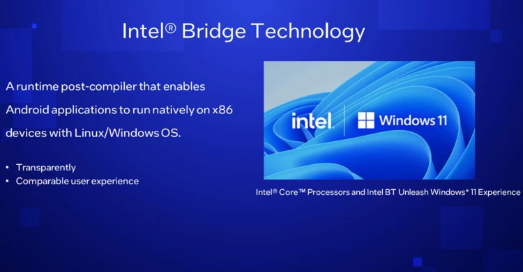 其中,Intel Bridge技术的核心是运行时后期编译器(runtime post-compiler),可将非x86指令直接编译成x86指令,无需任何进一步修改,就能让Android应用运行在基于x86处理器、Windows系统的设备上。