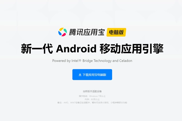 最关键的是,无论IntelBridge、Celadon技术,还是腾讯应用宝电脑版,都具有广泛的普适性,硬件平台可以支持Intel酷睿,操作系统支持Windows 7/10/11,内存最低只需8GB,可以说几乎没有什么门槛。