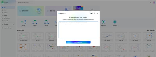 AI能力加持下,Wondershare EdrawMind支持一键生成多层级思维导图,用户只需输入对应需求和问题,亿图AI即可自动生成思维导图,减少用户思考的时间,帮助用户激发更多灵感。