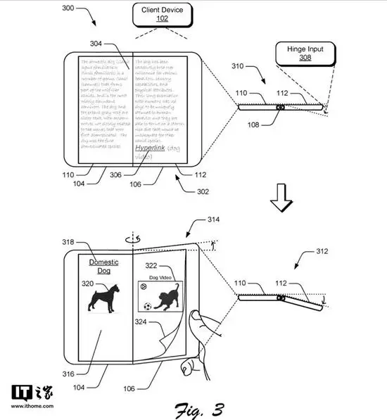 该专利标题为Navigational Aid for a Hinged Device via Semantic Abstracti(通过语义抽象为铰接设备提供导航帮助),于2017年1月申请,该专利建议处理文件能够易于像书本一样导航,并且铰链中的传感器可以允许用户通过合上设备部分的“页面”,类似于合上书籍以快速翻页。