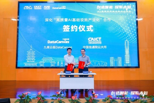 大会同期举行了中国信通院云大所和九章云极DataCanvas公司深化“高质量AI基础设施产业化”合作签约仪式,双方将在此前标准制定、评估评测、技术创新、产业研究等丰富合作的基础上,发挥各自在AI基础设施方向理论研究、技术创新和应用实践的资源优势,打通AI基础设施上下游生态链,共建开放、强大、灵活的AI基础设施生态。中国信通院云大所副所长魏凯表示,九章云极DataCanvas公司和中国信通院云大所再度携手,将聚焦大模型产业体系的搭建,加速大模型在金融、通信、交通等垂直行业的应用赋能。