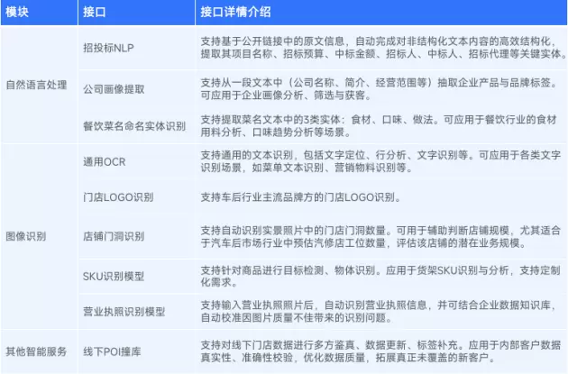 如今,这一能力正式通过API的方式对企业开放。百炼Aideas智能营销应用市场的智能服务API模块,以自然语言处理、图像识别和知识图谱三大AI技术为基础,深耕餐饮、零售、食品饮料、汽车后市场、招投标等实际业务场景,衍生10余种营销大数据治理模型。