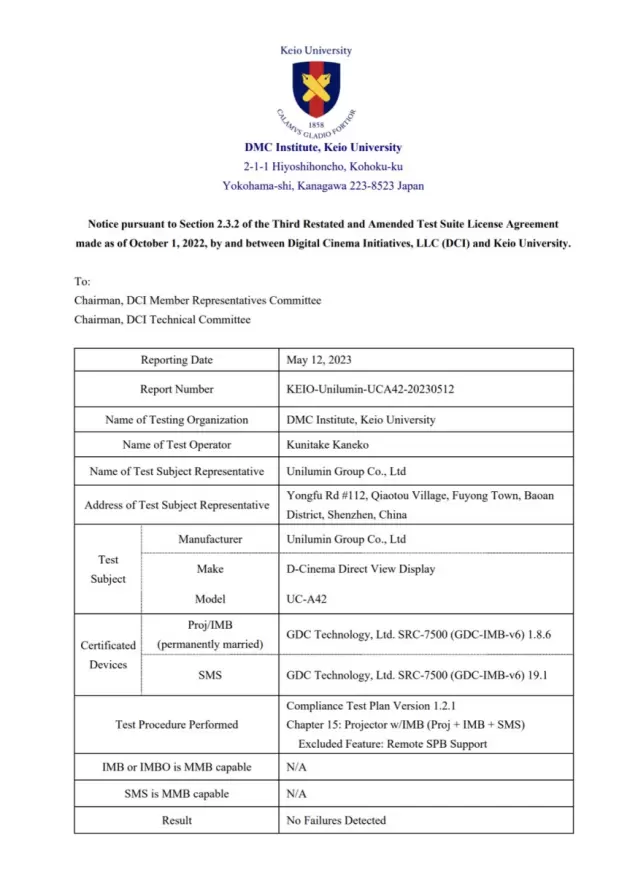 2023年5月,喜讯又一次传来——洲明UC-A42成功通过相关检验测试,成为其第三款获得DCI认证的电影放映系统产品,再次代表国产LED电影科技收获全球影院显示市场的“必备通行证”。