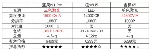 音效方面,极米H5有哈曼调教音效,坚果N1 Pro有丹拿,当贝X5稍弱;噪音方面,极米H5最高,为28分贝,当贝X5最低,仅24分贝,坚果N1 Pro居中。
