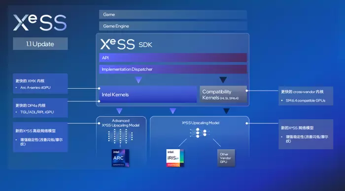 关于Arc显卡的优化方向,主要就是游戏体验和内容创作两大部分。首先是游戏体验,这里就必须要提到XeSS超采样技术,通过使用神经网络辅助运动矢量,以较低的分辨率渲染游戏,然后利用 AI 技术将图像提升至更高的分辨率,它可以在提升分辨率的同时,保证更高的性能,减少游戏卡顿,从而提升玩家的游戏体验。除了有越来越多游戏支持了这项技术外,英特尔也在不断改进这项技术,从最开始的1.0版本来到了如今的1.1版本,优化了内核,并采用新的Xess高级网络模型,降低了延迟,提升了游戏性能以及稳定性。
