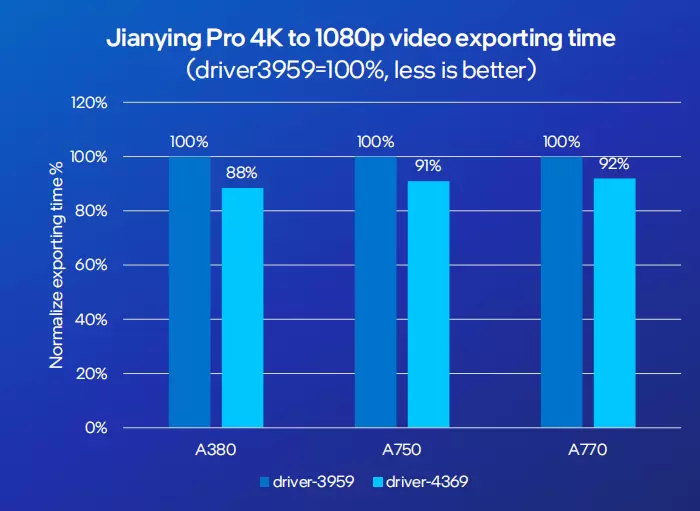 同时,通过驱动优化,还实现了剪映特效着色器(Shader)性能近一倍的提升,满足了剪映OpenGL ES on D3D11软件栈与英特尔锐炫显卡的充分适配,使用锐炫GPU的内存压缩技术,从而缓解剪映专业版特效 shader的显存带宽压力,将shader性能提升了一倍左右,帮助用户节省约40%的导出时间(4369版对比3959版)。