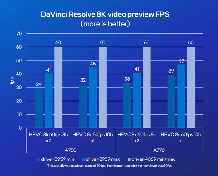 锐炫GPU配备了2个专用视频后处理引擎,通过驱动的优化,DaVinci能够充分利用英特尔锐炫显卡的视频后处理器引擎,从而带来近2倍性能提升,这实现了双路8K60FPS视频素材的实时预览。
