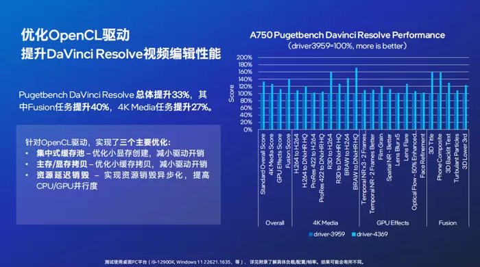 英特尔驱动针对内容创作进行了持续的优化,通过减少额外消耗,充分释放出锐炫硬件性能。针对OpenCL驱动实现了三个主要优化,提升了DaVinci Resolve视频编辑性能。全新的4369版驱动相比于3959版驱动,Pugetbench DaVinci Resolve总体提升33%,其中Fusion任务提升40%,4K Media任务提升27%。