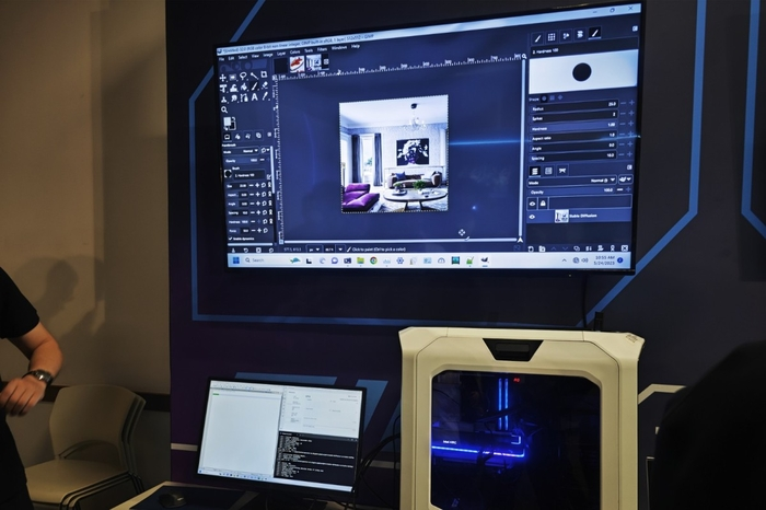 在活动现场设置的演示区,基于英特尔OpenVINO,AI绘图开源模型Stable Diffusion可以使用开源图片编辑软件GIMP在英特尔锐炫A750、A770等显卡上流畅运行,通过输入简单的文字,仅需很短的时间变可以实现创意绘图,帮助用户提升效率。当然,除了图片生成外,还支持智能P图、超分辨率、风格迁移等丰富的功能,生成式AI有着非常多的应用场景和广阔发展前景。