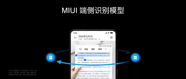 端侧隐私能力一方面可以完成端侧图片提取文字功能,利用端侧识别模型,MIUI14可以在本地完成文字识别和提取的全过程,实现零数据上云。无论是个人证件信息还是涉密商业合同,用户都可以放心提取其中的文字信息,识别更快也更准。