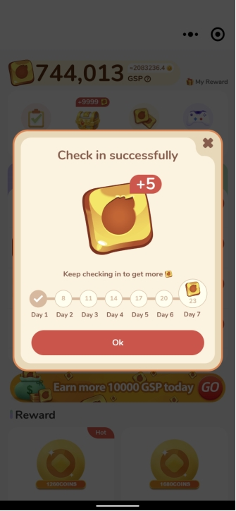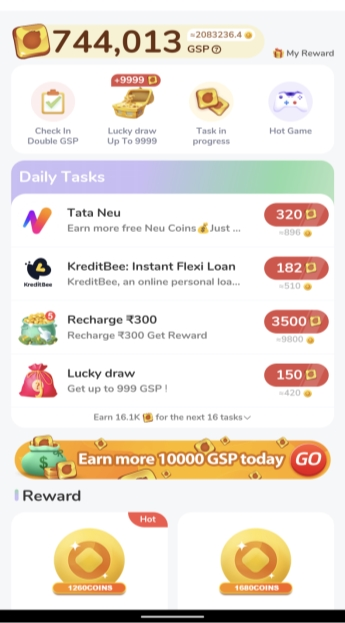 首先,基于网络赚钱用户对简单化、多样化任务和高价值奖励的需求,主页突出Daily Tasks和Reward两大模块,将Daily Tasks任务模块放置在页面正中间,在下方呈现奖励模块。然后,主页顶部鲜明地展示GSP(全程)数值体系,GSP数值变化一目了然,激励用户不断完成任务获取积分,以兑换自己想要的奖励。