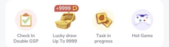 GSP数值体系下方的四个ICON,从左到右分别是签到模块、互动游戏、互动墙任务和竞技游戏,为用户提供更多互动娱乐选择,满足用户各种玩乐需求。
