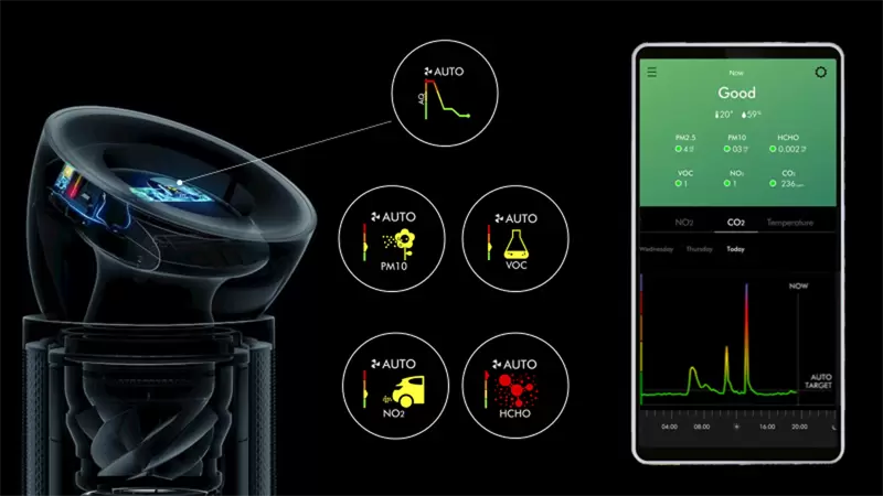 戴森最全传感器系统1,监测多种室内污染物并提供实时可视化反馈。Dyson purifier big+quiet formaldehyde BP04空气净化器首次集五大传感器于一身,包括固态甲醛(HCHO)传感器、颗粒物传感器、温度和湿度传感器、气体传感器,以及戴森首个二氧化碳传感器6。五大传感器持续监测,搭配独特的戴森算法每秒交叉检查数据,分析室内空气状况,并在戴森LCD显示屏和MyDyson™应用程序8/微信小程序中实时环境监测数据结果。同时,MyDyson™应用程序8/微信小程序还可以作为遥控器与设备互联,即使用户不在家中,也可以通过应用程序远程操控设备并监测室内空气质量,带来安心的净化体验。