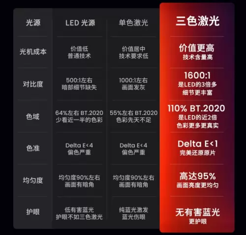 色差、对比度、色彩这三方面更能看出区别,由于LED光源为主的投影仪存在偏色,对比度在1000:1以下, 90%以上的sRGB色域覆盖,普遍低于三色激光,所以一般不会标注,即使宣传也是模糊用词,如“色彩真实、原彩画质”等。