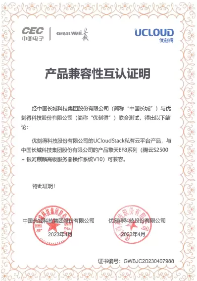 信创生态再突破:UCloud优刻得私有云与中国长城擎天DF7、EF8系列服务器完成产品兼容互认证