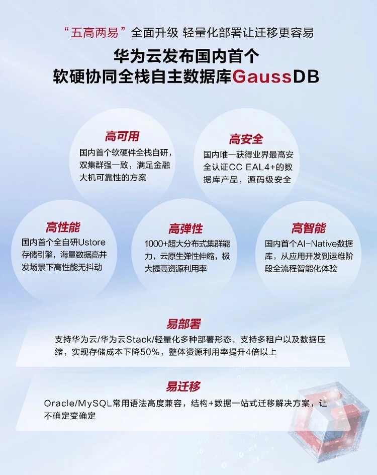 作为新一代分布式云数据库,GaussDB通过多维度的技术创新,在行业实践中构筑了高可用、高安全、高性能、高弹性、高智能的技术优势,而在数据库替换场景中,又具备易部署、易迁移的特性。