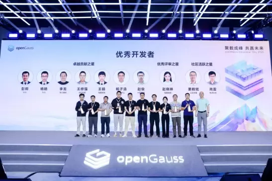 主论坛的最后一个环节是社区优秀开发者颁奖典礼,对过去一年里 openGauss 内核贡献较高的优秀开发者给予嘉奖。云和恩墨数据库内核研发工程师王修强获颁“卓越贡献之星”称号,openGauss 认证培训讲师姜殿斌获颁“社区活跃之星”称号。