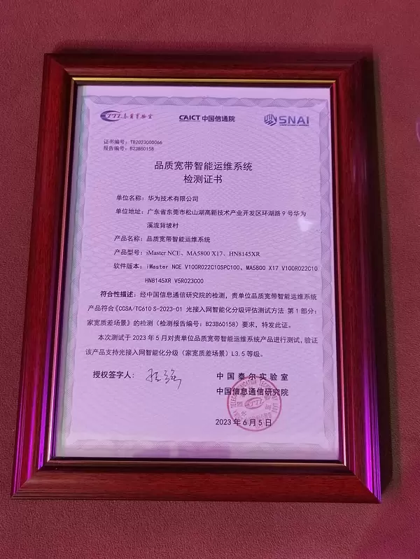 华为品质宽带智能运维系统首测业界第一 ,荣获CAICT光接入网智能化分级L3.5等级认证