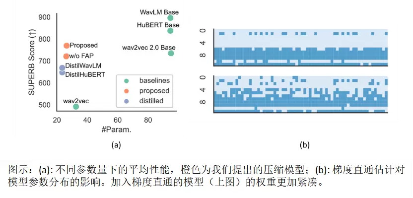 核心内容:近年来,基于无监督预训练技术的语音表征模型为许多语音任务带来了显著的进步,但另一方面,这些模型通常包括大量的参数,对硬件平台的计算能力和内存空间有很高的要求。为了将大模型部署到生产环境,模型压缩技术至关重要。结构化剪枝不需要特殊硬件就可以实现参数压缩和推理加速,是一种对硬件友好的模型压缩方法,但同时也会带来较大的性能损失。为了弥补性能损失,我们提出了一种细粒度的注意力头剪枝方法;除此之外,我们将梯度直通估计(Straight Through Estimator,STE)引入到L0正则化剪枝方法中,让模型参数的分布更加紧凑,从而实现了进一步的加速。我们在SUPERB排行榜上的实验表明,我们的压缩模型比Wav2vec 2.0 Base模型平均性能更好,同时参数量比前者减少30%,推理时间比前者减少50%。