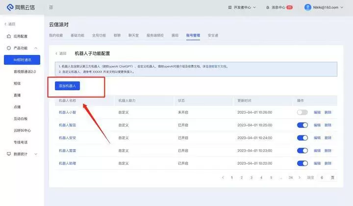 第一步:进入网易云信账号后,在账号管理处找到【机器人 - 子功能配置】。