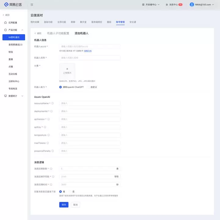 从现在起,网易云信 IM 支持完整对接 Azure OpenAI GPT,实现文字互动能力,同时支持设置各参数与消息回溯范围,开发者无需关注 GPT 接口,仅需在网易云信配置即可快速生成属于自己的 AI 机器人。(了解 Azure OpenAI 服务:https://learn.microsoft.com/zh-cn/azure/cognitive-services/openai/overview)