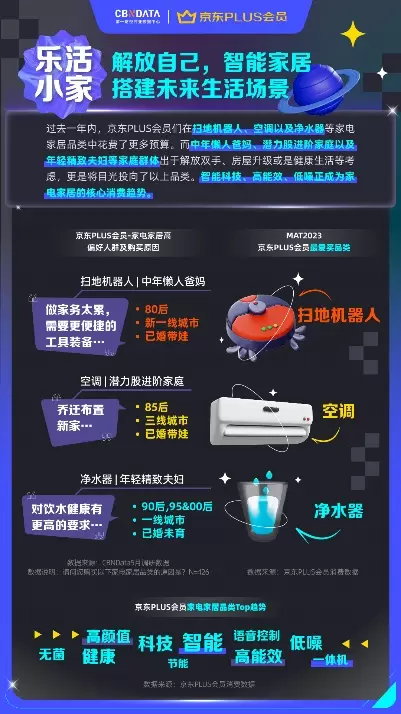 在家居品类上,则呈现出明显的智能化、健康化、高能效消费趋势,越来越多的用户希望借助高品质智能家居来搭建未来生活场景。根据平台消费数据,过去一年内,京东PLUS会员们在扫地机器人、空调、净水器等家电品类上投入了更多预算。