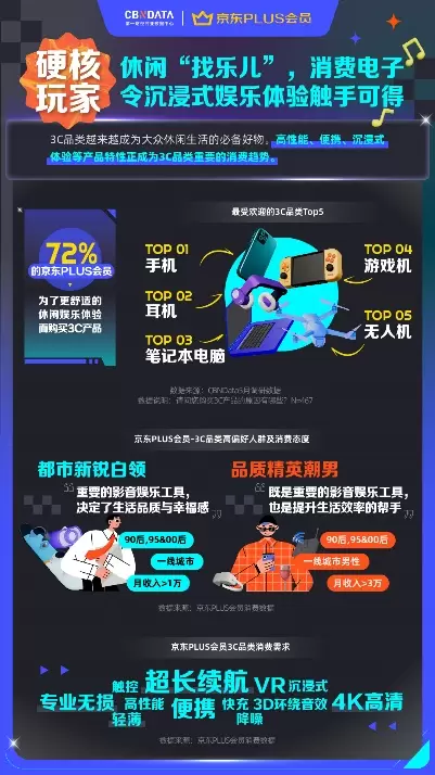 在娱乐消费上,高性能、便携式、能够带来沉浸式体验的 3C品类保持着高增长趋势。CBNData调研数据显示,72%的京东PLUS会员为了更舒适的休闲娱乐体验而购买3C产品,如手机、耳机、笔记本电脑、游戏机、无人机等。