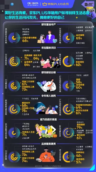《我的生活高光时刻—万千京东PLUS会员的2023消费趋势图鉴》指出,京东PLUS会员用户的主流人群画像可以分为以下六类,都市富裕中产、年轻精致夫妇、都市新锐白领、中年懒人爸妈、潜力股进阶家庭、品质精英潮男。