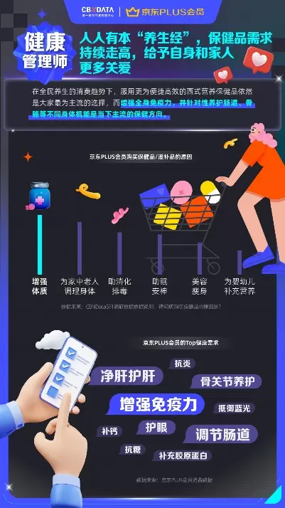从京东PLUS会员的消费偏好来看,服用便捷高效的西式营养保健品仍然是主流选择,其中增强免疫力成为普遍需求,此外养护肠道、骨骼等身体机能也是当下的主流保健方向。