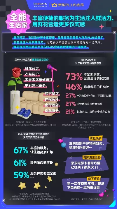 CBNData5月调研数据显示,服务品质高、响应速度快、种类全面,是平台会员用户选择京东生活服务的主要因素。值得一提的是,73%的会员用户表示会不定期在京东平台预定鲜花,以此来营造生活的仪式感,为平淡日常增添一抹亮色。