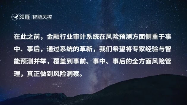 审计部门被称为风险防范的“守门员”,其重要性不言而喻。而随着数字化、智能化过程在金融行业不断深入,审计系统不断更新发展,审计工作的内涵也不断扩充。领雁科技作为深耕这一领域多年的科技公司,正用不断创新的产品来深度满足客户需求,推动审计工作的智慧化演进。