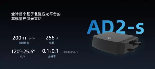 此外,基于「北醒应龙」平台技术的车规量产激光雷达AD2-s,能够在10%反射率的条件下能够实现200米远的探测,有效线数256线,分辨率可以做到0.1×0.1,并将于今年量产交付。