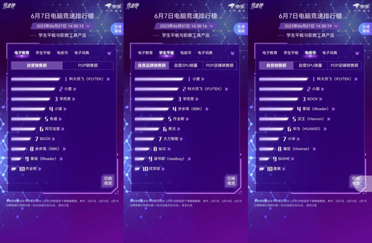 在竞速排行榜中,科大讯飞更是连续多日稳坐电子教育、学生平板、电纸书自营成交额的头把交椅。从以上数据可以看出,拥有品质低价与品质性能的科大讯飞,正俘获越来越多用户的认可和信任。
